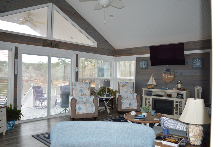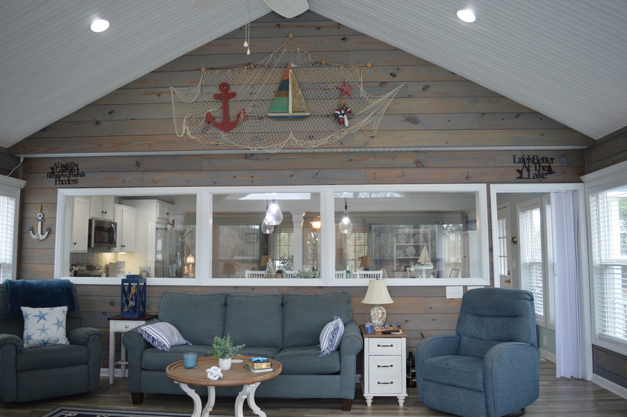 Large 1.23 acre Gently sloping lot with cove and main channel views. This 3br/2ba home has been renovated to include a new kitchen, sunroom & great room. Spacious lakeside porch and a covered road side porch. There are two 24 x 24 carports, and a storage building, Very nice, covered dock with screen gazabo. Sandy beach. Great location overlooking State Park. The adjacent lot has it's own septic and dock .Property is convenient to I-77.